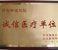 2011年3月,济南神康医院被山东商报社、山东新闻网等相关部门评为 “诚信医疗单位”,这是山东社会各界对神康诚信行医的肯定。医德高尚的专业人员和精湛过硬的技术造就了神康的诚信之路,全体医务工作者奋力拼搏、勇于创新,开创了山东精神疾病专业诊疗的典范,为我省、市精神卫生专业领域发展起到了积极的推动作用。建设弘扬诚信医疗之风,营造和谐的医疗卫生环境,是对患者和医院利益的双重保障。